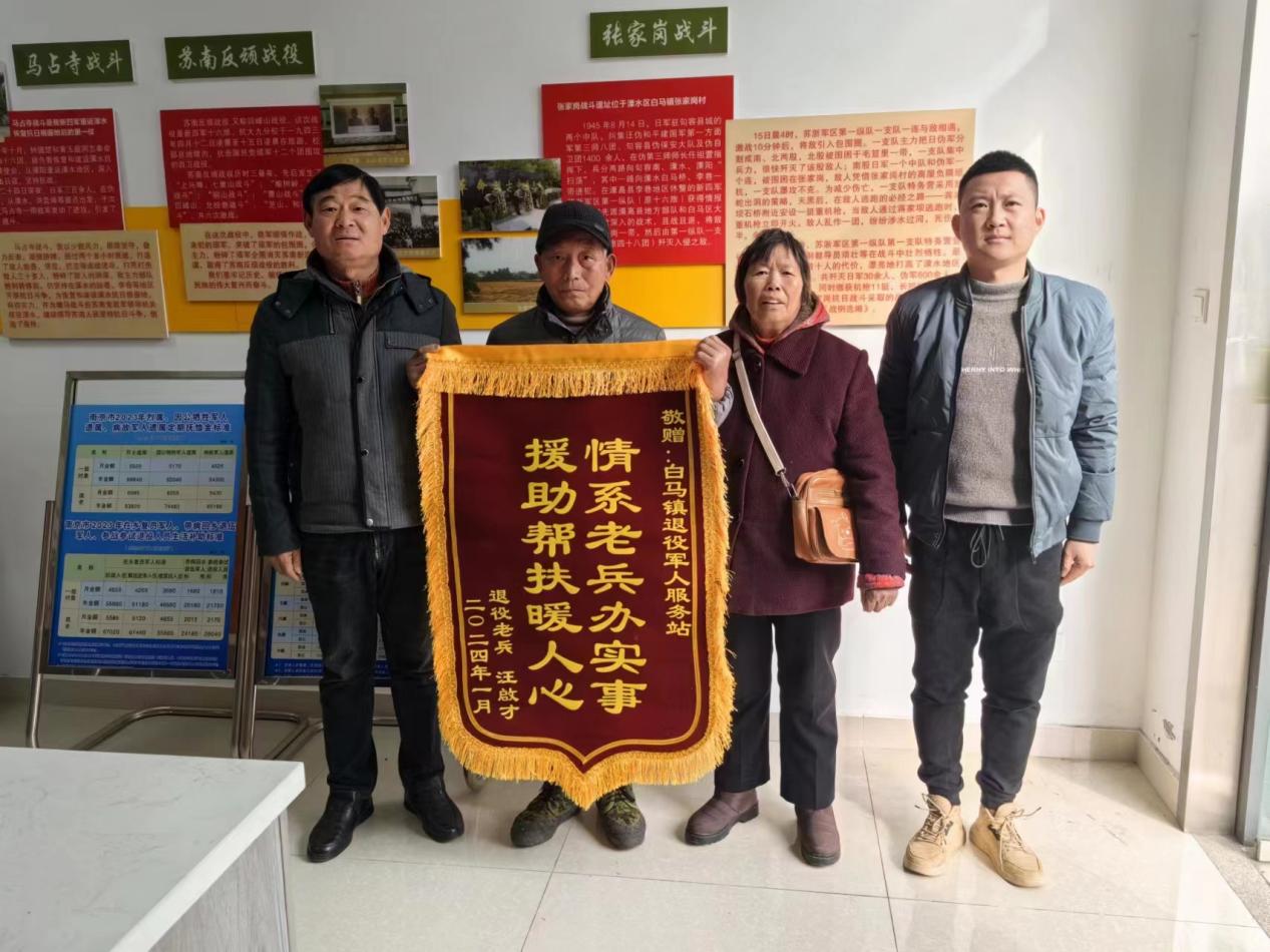 2024年1月,为了减轻汪啟才家庭的医疗负担,白马镇退役军人服务站为其申请办理了免费的困难退役军人“防癌抗癌专属保险”,与此同时,上洋社区还为其成功申请了低保。这一系列的关怀举措,让汪大爷在困境中深深感受到党和政府的温暖和支持,为此,汪大爷夫妻二人特意到镇退役军人事务站送了一面锦旗表达自己的感激之情。