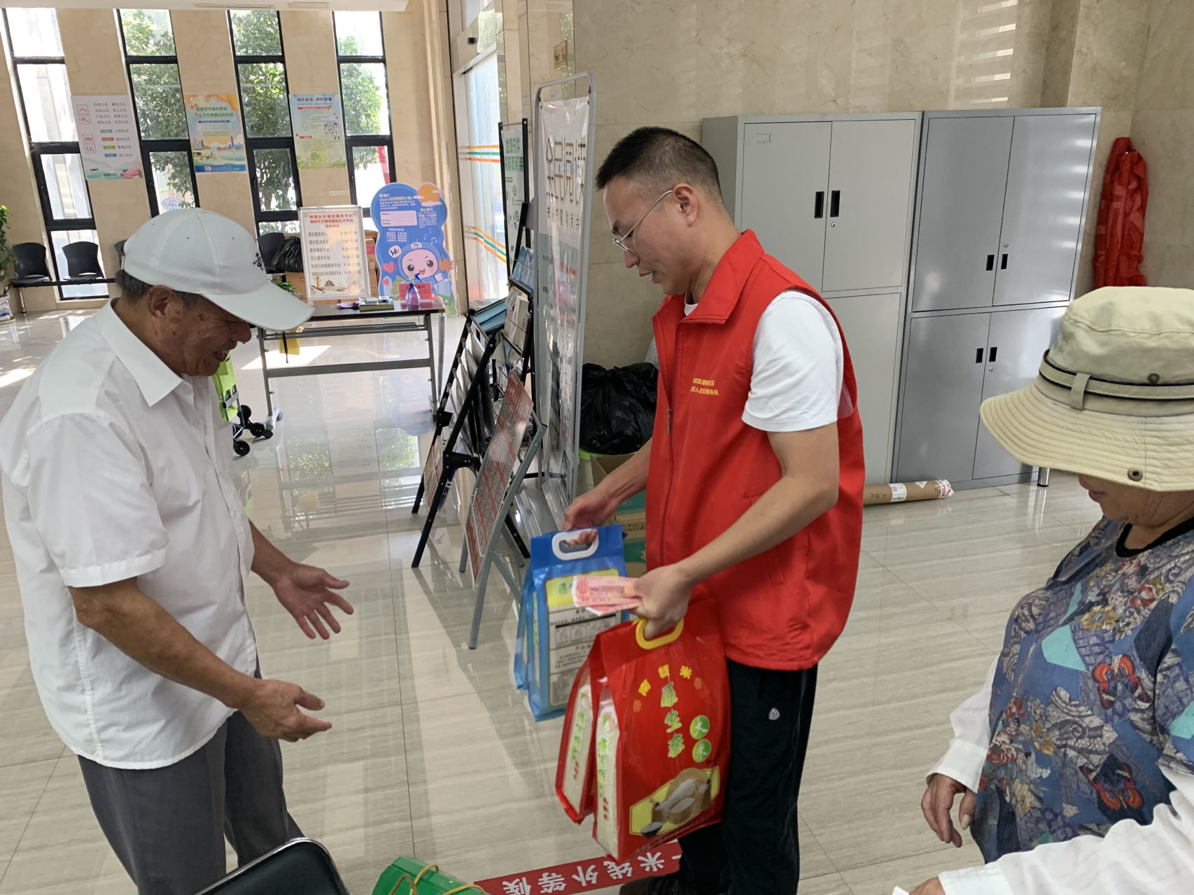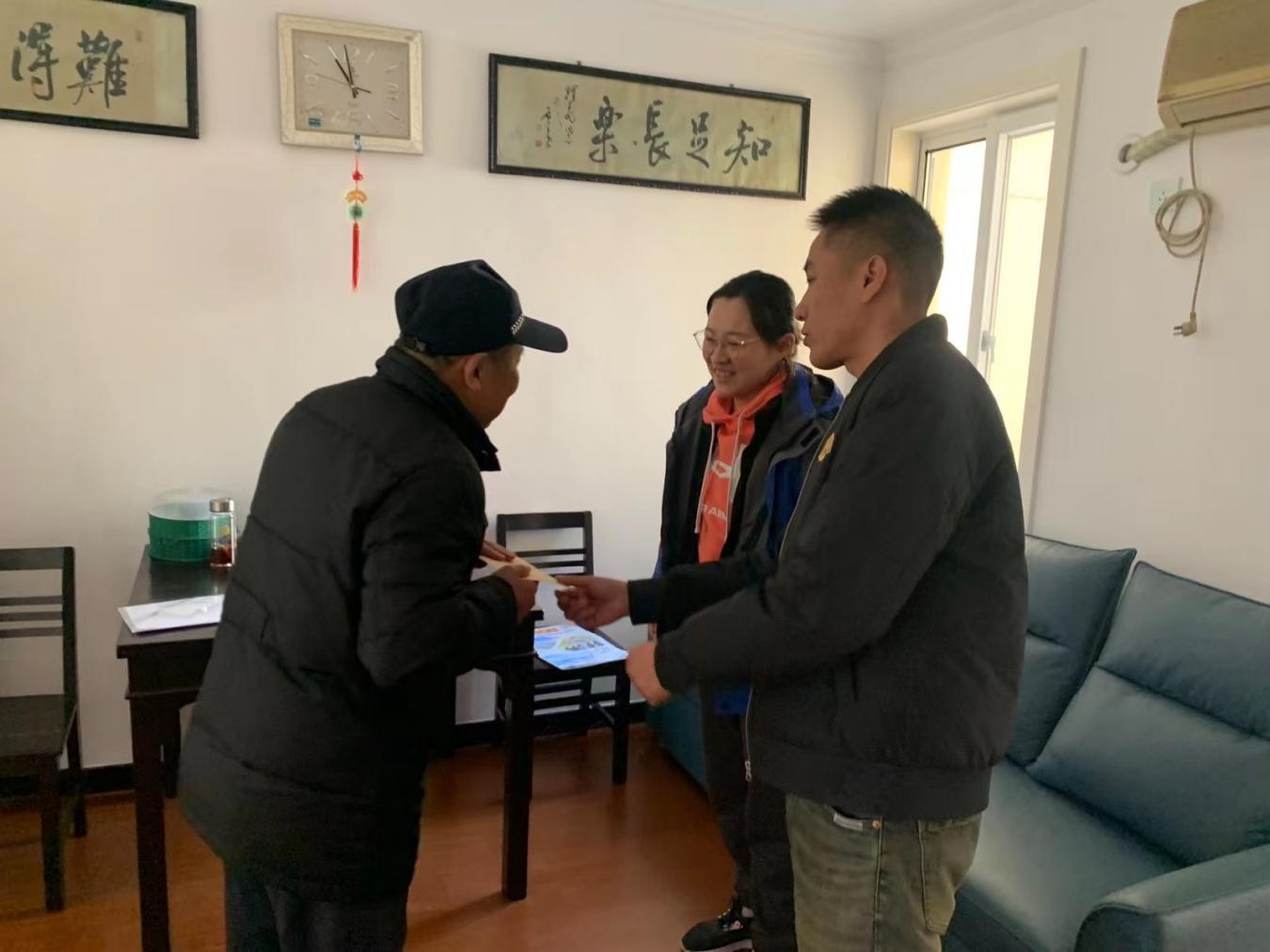 服务站工作人员为退役军人杨老送上慰问金和慰问品