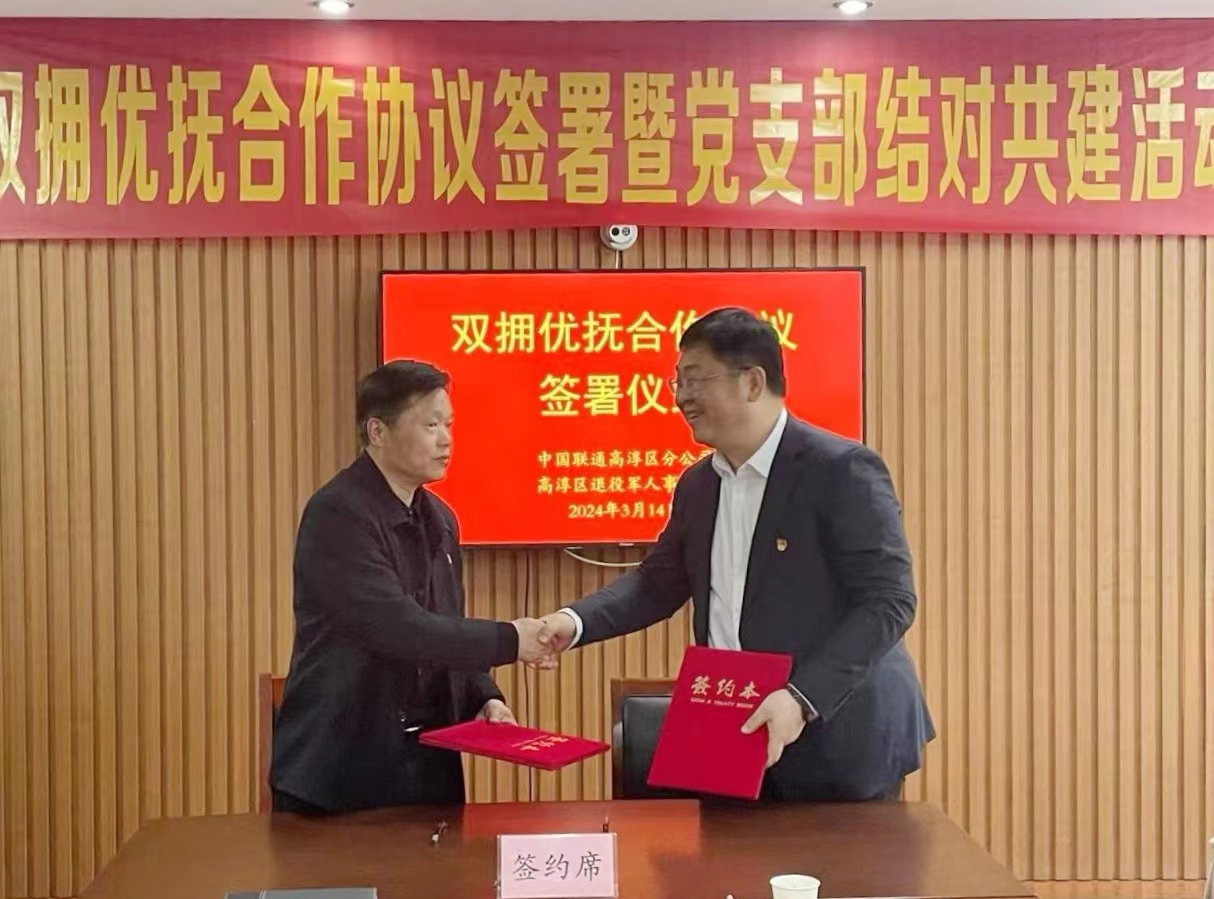 3月14日下午,南京市高淳区退役军人事务局与中国联通高淳区分公司举行双拥优抚合作协议签署暨党支部结对共建活动,通过党建引领,推动新时代双拥工作高质量发展。高淳区退役军人事务局、中国联通高淳区分公司相关领导出席仪式。